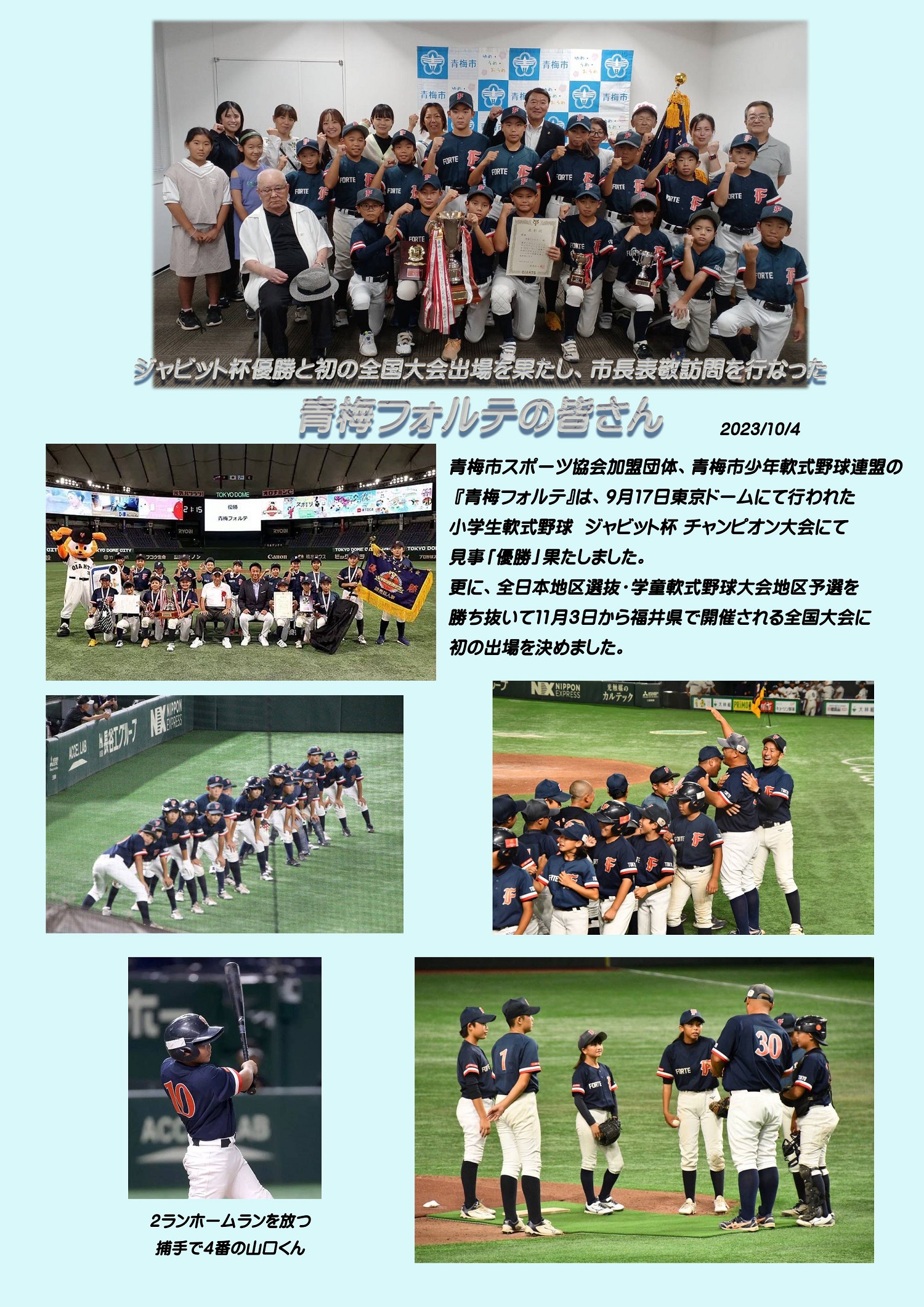 青梅市スポーツ協会加盟団体の青梅市少年軟式野球連盟の「青梅フォルテ」が9/17(日)に東京ドームで行われた「小学生軟式野球ジャビット杯チャンピオン大会」にて優勝を果たしました。 更に、全日本地区選抜・学童軟式野球大会地区予選を勝ち抜き11/3から福井県で開催される全国大会に出場(初)いたします。選手皆様の健闘をお祈り申し上げます。